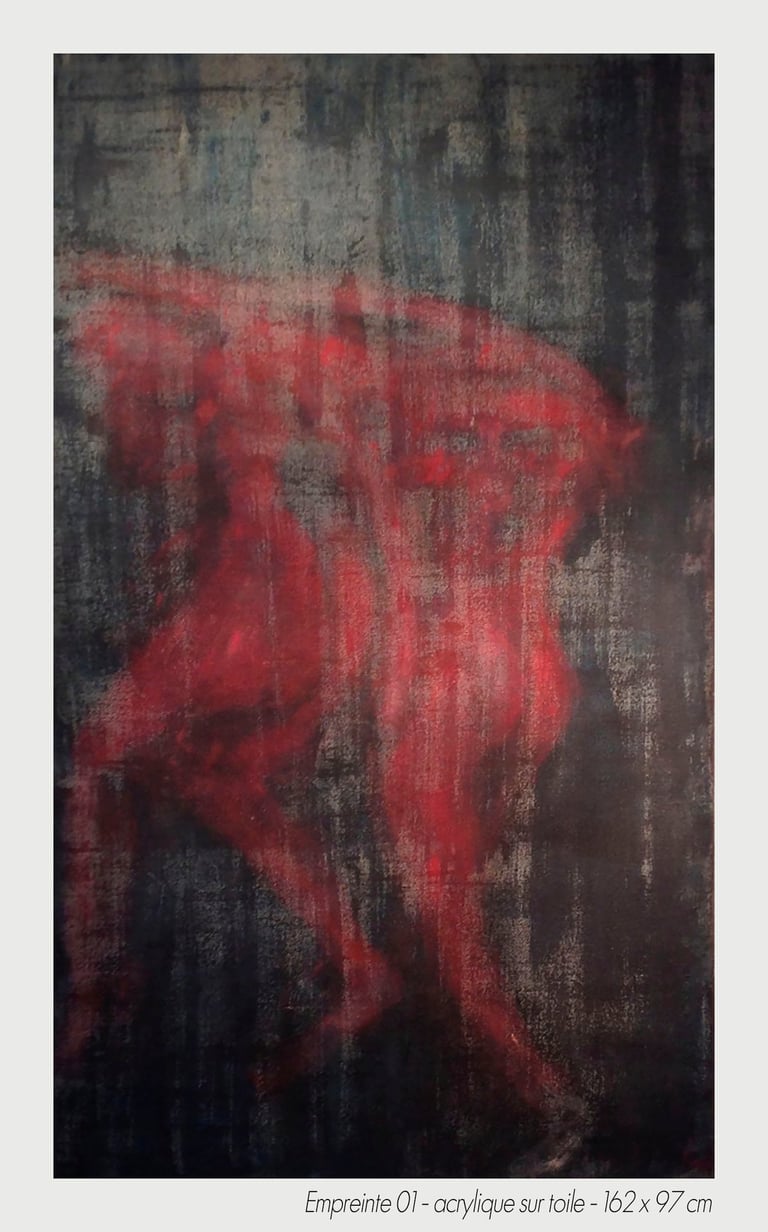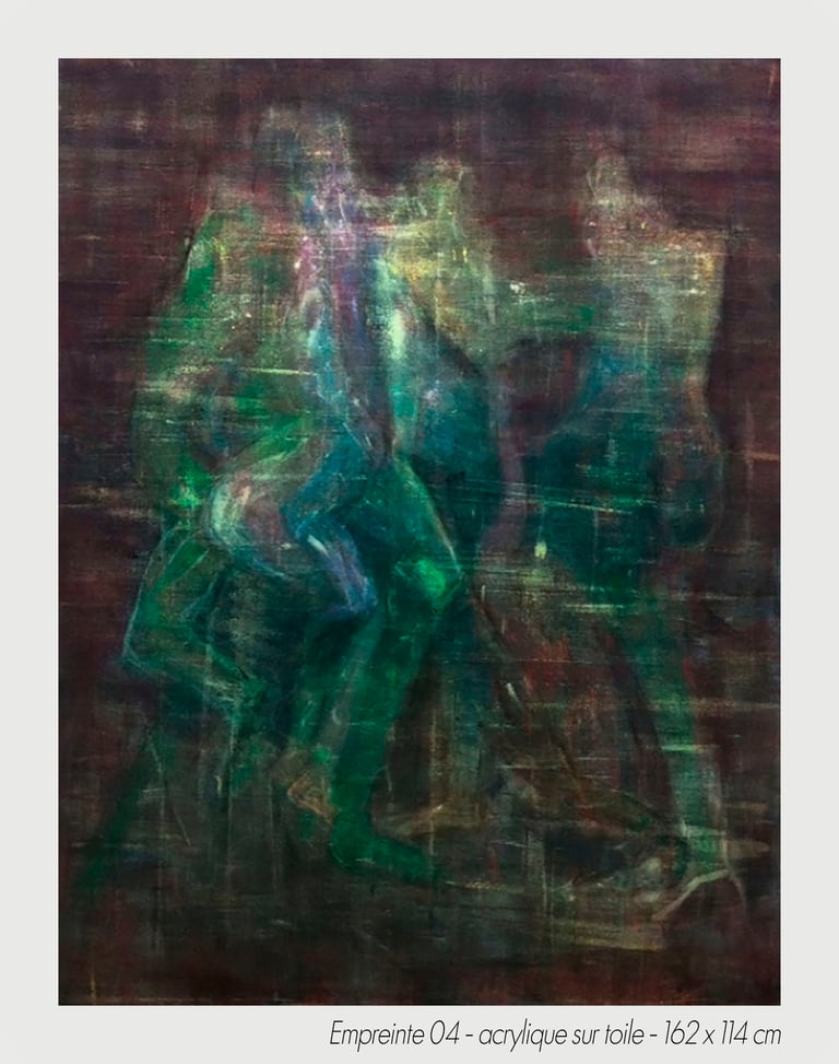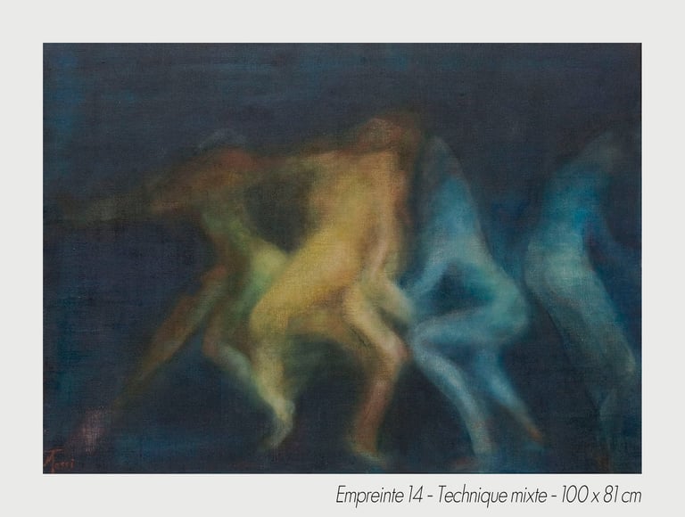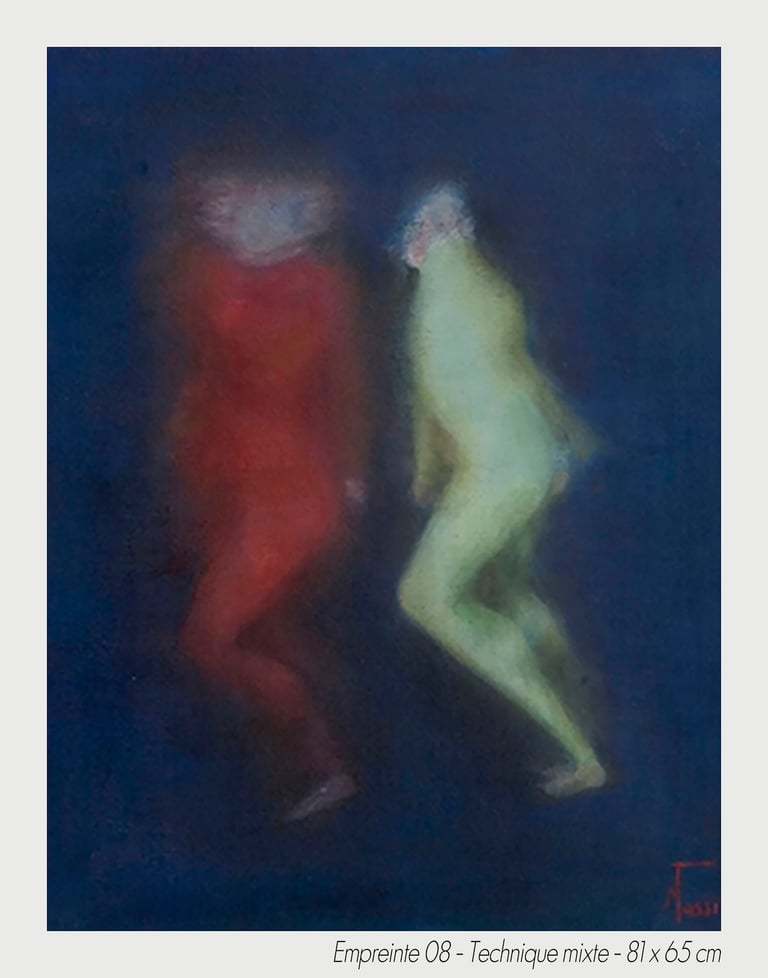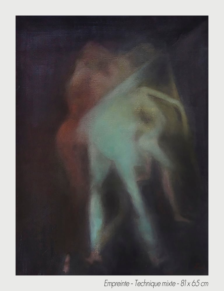 In the experiment of a sudden chill, the artist Michèle Tassi pursues the progress of an exploration. The presented bodies appear by couple or in groups, appearing by the transparency, which constitutes them, to print on blurred canvas their movement’s imprint.