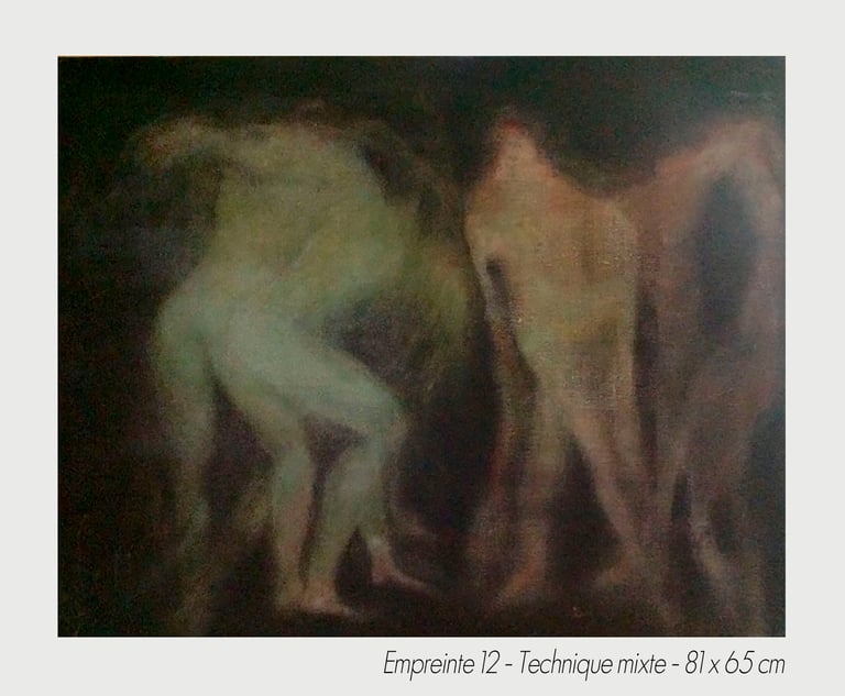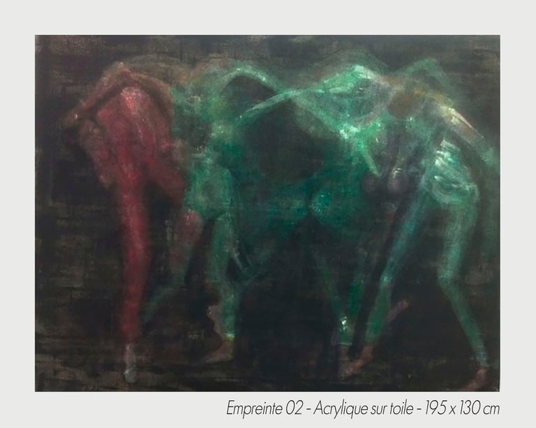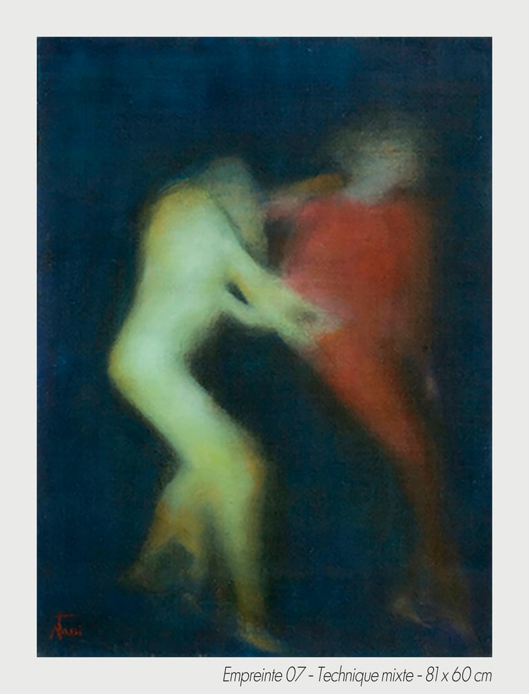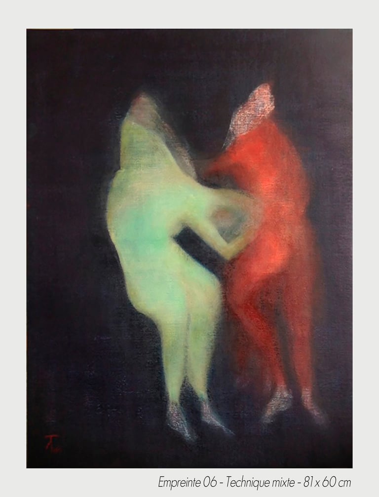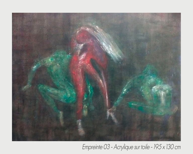 In the experiment of a sudden chill, the artist Michèle Tassi pursues the progress of an exploration. The presented bodies appear by couple or in groups, appearing by the transparency, which constitutes them, to print on blurred canvas their movement’s imprint.
